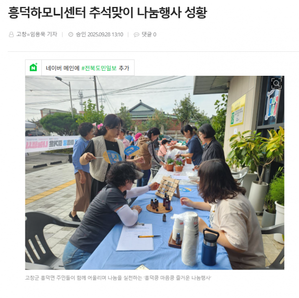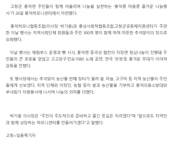 흥덕하모니센터의 건강한 추석맞이 특별행사 최고관리자 2025-09-29 최고관리자 0 211 09.29 17:36 고창군공동체지원센터와 흥덕하모니협동조합(이사장 박기용), 흥성사회적협동조합이 주관한 이날 행사는 지역사회단체 회원들과 주민 300여 명이 함께 하며 큰 호응을 얻었다.