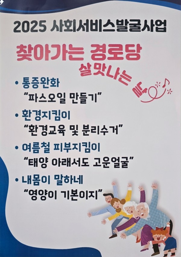 아로마향을 이용한 파스오일 만들기, 환경교육 및 분리수거 교육, 천연팩을 이용한 얼굴맛사지, 고고장구팀 초청하여 흥을 돋구고 먹거리를 나누며 찾아가는 경로당 설문조사까지..